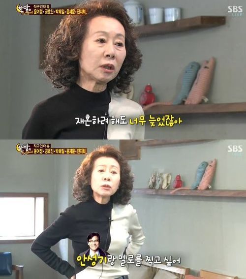 윤여정은 17일 오후 방송된 SBS '한밤의 TV연예‘에서 안성기와 멜로를 찍고 싶다고 말하며 “한 번도 안 해봤기 때문”이라는 이유를 설명했다.