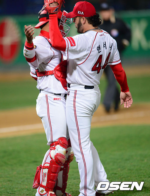 경기를 마무리지은 KIA 투수 앤서니와 포수 김상훈이 특유의 세리머니로 승리를 기뻐하고 있다.