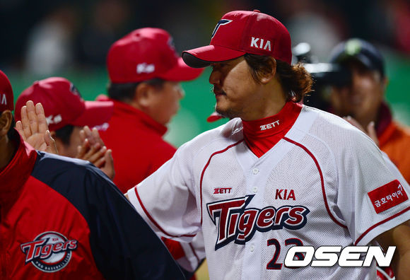 경기 종료 직후 KIA 최희섭이 동료들과 하이파이브를 나누고 있다.