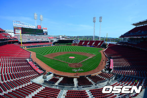 18일(이하 한국시간) 미국 오하이오주 신시내티 그레이트 아메리칸 볼파크에서 '2013 메이저리그' 신시내티 레즈와 필라델피아 필리스의 경기가 열릴 예정인 가운데 그라운드가 정비되고 있다.