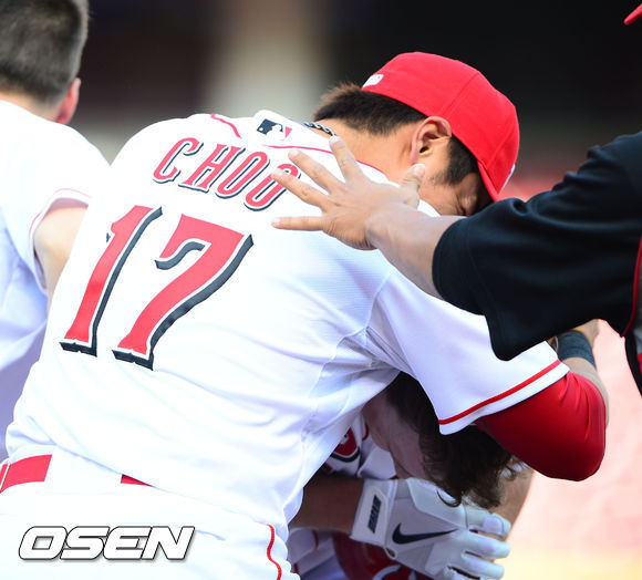 9회말 무사 주자 만루 신시내티 제이 브루스가 끝내기 안타를 날리자 덕아웃에서 있는 추신수가 달려나와 브루스를 껴안고 있다. / rumi@osen.co.kr