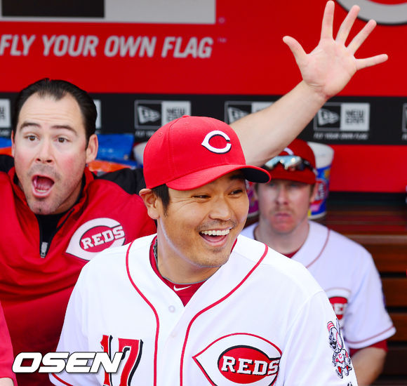 서스펜디드 경기 전 덕아웃에서 신시내티 추신수가 환하게 웃고 있다. / rumi@osen.co.kr