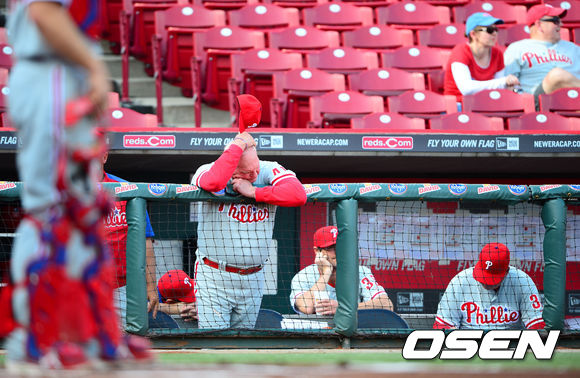 9회말 무사 주자 만루 신시내티 제이 브루스 타석에서 필라델피아 찰리 매뉴얼 감독이 아쉬워하고 있다. / rumi@osen.co.kr