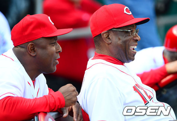경기 전 신시내티 빌리 해처 코치와 더스티 베이커 감독이 즐겁게 얘기를 나누고 있다. / rumi@osen.co.kr