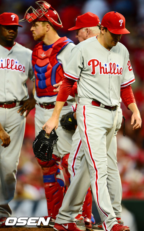 2회말 2사 주자 만루에서 신시내티 브루스의 우전 2타점 적시타를 맞은 필라델피아 선발 존 래난이 강판 당하고 있다.
