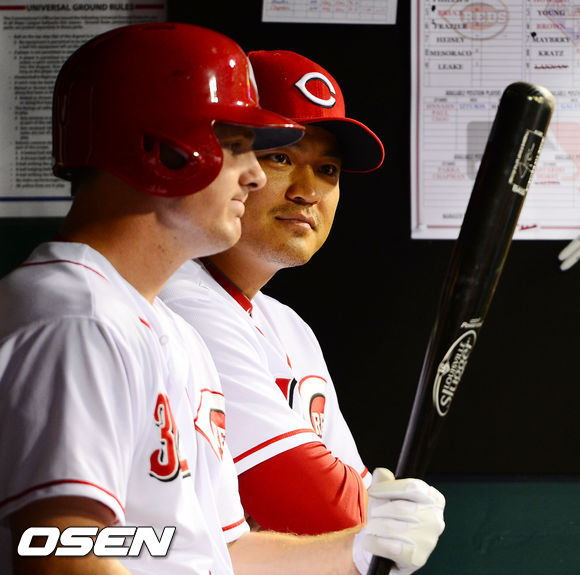 덕아웃에서 신시내티 추신수가 브루스의 배트를 살피고 있다.