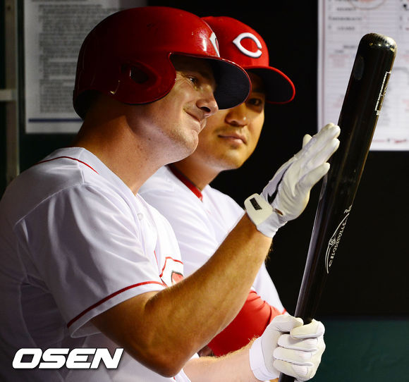 덕아웃에서 신시내티 추신수가 브루스의 배트를 살피고 있다.