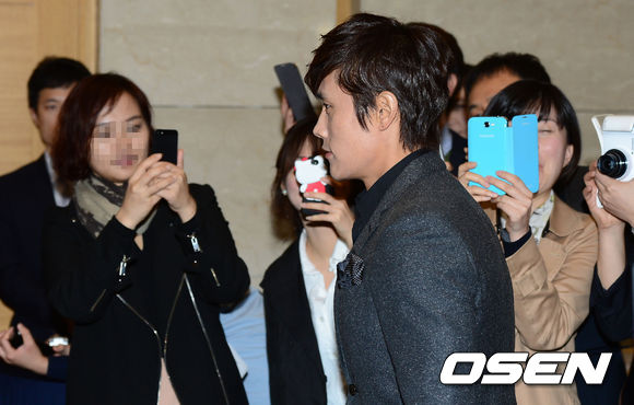 팬택의 모델로 활동중인 배우 이병헌이 포토타임을 하기 위해 입장하고 있다.
