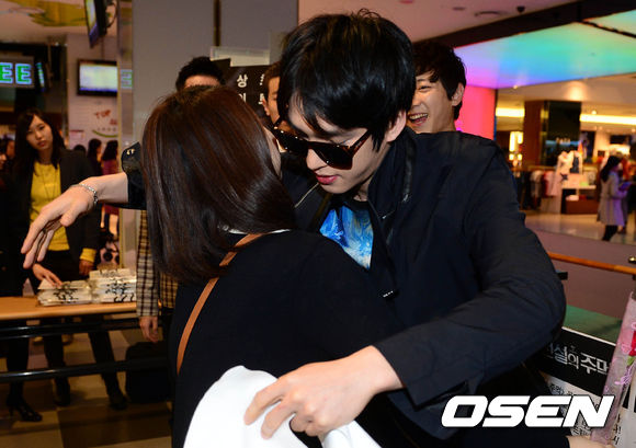 18일 오후 서울 CGV 목동에서 열린 영화 '전설의 주먹' 장미꽃 증정 이벤트에서 구원이 한 팬과 포옹을 하고 있다.