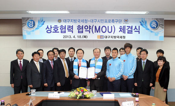 대구FC가 18일 오후 3시 정부대구지방합동청사에서 대구지방 국세청과의 업무협약을 체결했다. 대구FC와 대구지방국세청은 상호협력을 통해 지역에 성실납세문화를 조성하고 건전한 시민의식 함양을 위해 협약식을 갖게 됐다.