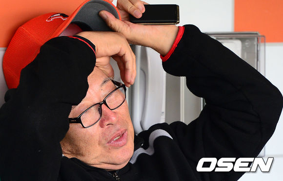 18일 오후 대전 한밭종합운동장 야구장에서 열린 2013 한국야쿠르트 세븐프로야구 한화 이글스와 NC 다이노스의 경기, 경기에 앞서 덕아웃에서 한화 김응룡 감독이 이마에 땀을 닦고 있다.