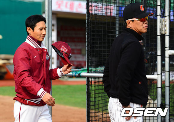 18일 오후 부산 사직구장에서 열린 '2013 한국야쿠르트 세븐 프로야구' 롯데 자이언츠와 넥센 히어로즈의 경기, 경기에 앞서 넥센 염경엽 감독이 롯데 김시진 감독에게 다가가고 있다
