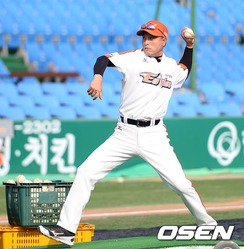 18일 오후 대전 한밭종합운동장 야구장에서 열린 2013 한국야쿠르트 세븐프로야구 한화 이글스와 NC 다이노스의 경기, 경기에 앞서 한화 송진우 코치가 배팅볼을 던지고 있다.