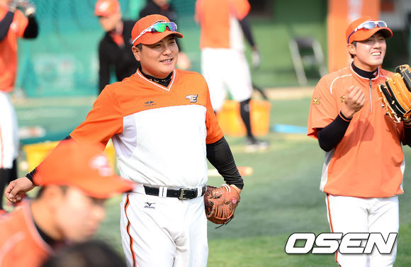 18일 오후 대전 한밭종합운동장 야구장에서 열린 2013 한국야쿠르트 세븐프로야구 한화 이글스와 NC 다이노스의 경기, 경기에 앞서 한화 김태균이 캐치볼 훈련을 하고 있다.
