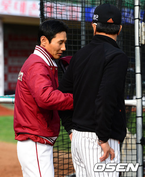 18일 오후 부산 사직구장에서 열린 '2013 한국야쿠르트 세븐 프로야구' 롯데 자이언츠와 넥센 히어로즈의 경기, 경기에 앞서 넥센 염경엽 감독이 롯데 김시진 감독의 팔짱을 끼며 이야기를 나누고 있다