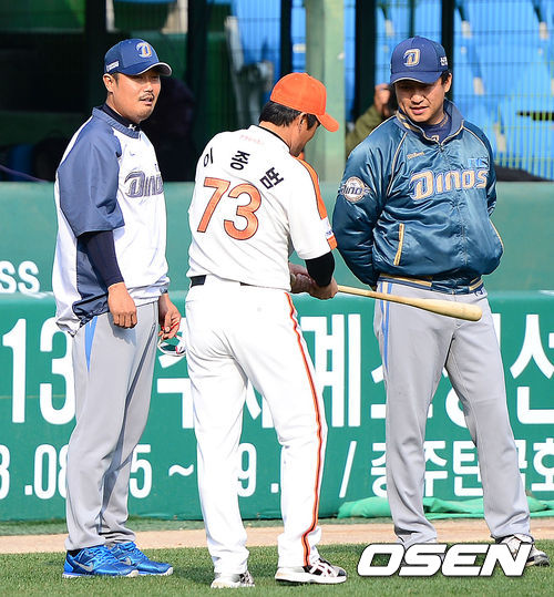 18일 오후 대전 한밭종합운동장 야구장에서 열린 2013 한국야쿠르트 세븐프로야구 한화 이글스와 NC 다이노스의 경기, 경기에 앞서 NC 이호준이 한화 이종범 코치와 이야기를 나누고 있다.