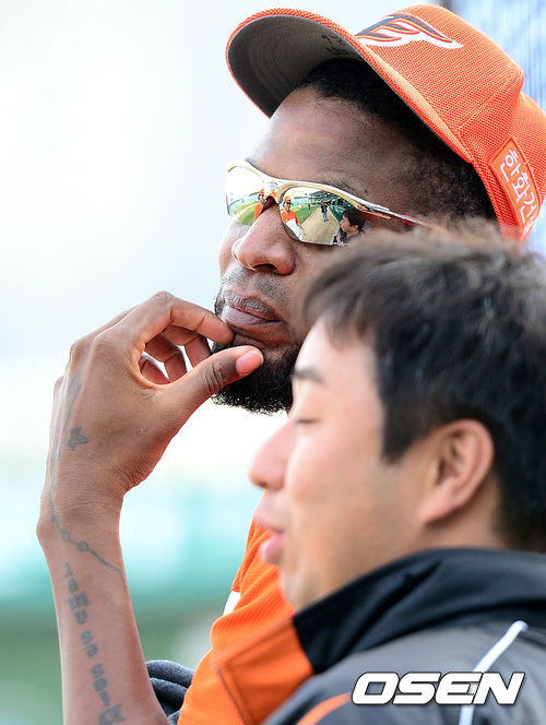 18일 오후 대전 한밭종합운동장 야구장에서 열린 2013 한국야쿠르트 세븐프로야구 한화 이글스와 NC 다이노스의 경기, 경기에 앞서 한화 바티스타가 관계자들과 이야기를 나누고 있다.