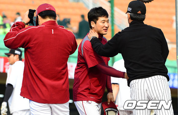 18일 오후 부산 사직구장에서 열린 '2013 한국야쿠르트 세븐 프로야구' 롯데 자이언츠와 넥센 히어로즈의 경기, 경기에 앞서 넥센 선수들이 연이어 롯데 김시진 감독을 찾아 인사를 하고 있다