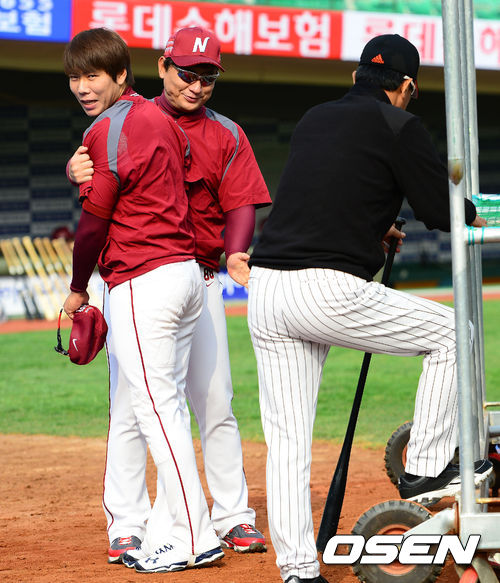 18일 오후 부산 사직구장에서 열린 '2013 한국야쿠르트 세븐 프로야구' 롯데 자이언츠와 넥센 히어로즈의 경기, 경기에 앞서 넥센 심재학 코치와 강정호가 롯데 김시진 감독과 이야기를 나누고 있다