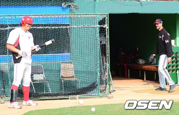 18일 오후 광주구장에서 열리는 '2013 한국야쿠르트 세븐 프로야구' KIA 타이거즈 대 LG 트윈스의 경기를 앞두고 KIA 최희섭과 LG 주키치가 대화를 나누고 있다.