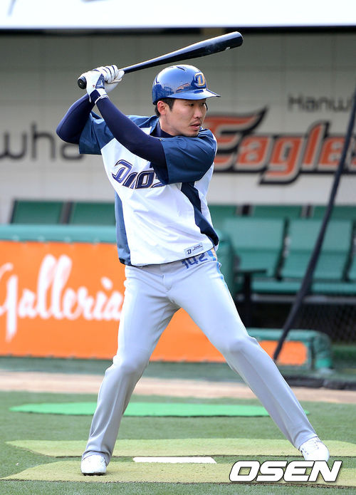 18일 오후 대전 한밭종합운동장 야구장에서 열린 2013 한국야쿠르트 세븐프로야구 한화 이글스와 NC 다이노스의 경기, 경기에 앞서 넥센에서 트레이드 된 NC 지석훈이 타격 훈련을 하고 있다.