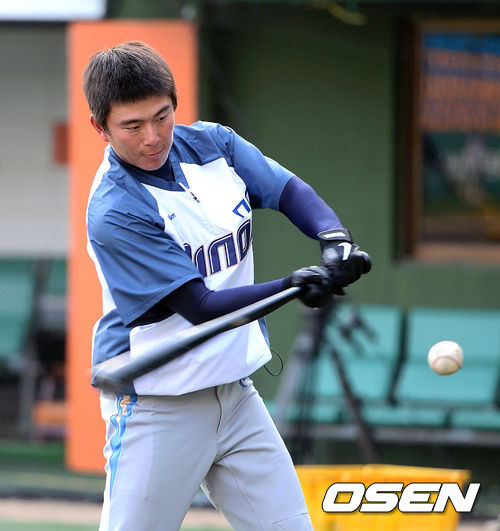 18일 오후 대전 한밭종합운동장 야구장에서 열린 2013 한국야쿠르트 세븐프로야구 한화 이글스와 NC 다이노스의 경기, 경기에 앞서 넥센에서 트레이드 된 NC 이창섭이 타격 훈련을 하고 있다.