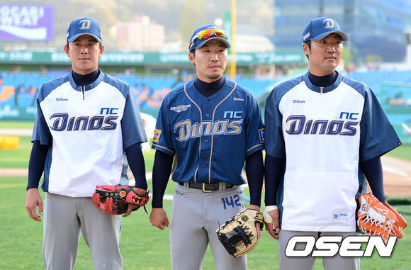 18일 오후 대전 한밭종합운동장 야구장에서 열린 2013 한국야쿠르트 세븐프로야구 한화 이글스와 NC 다이노스의 경기, 경기에 앞서 넥센에서 트레이드 된 NC 이창섭, 지석훈, 박정준이 취재진을 향해 포즈를 취하고 있다.