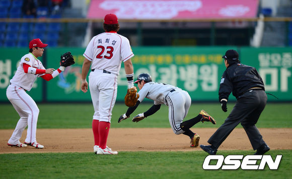 18일 오후 광주구장에서 '2013 한국야쿠르트 세븐 프로야구' KIA 타이거즈 대 LG 트윈스의 경기가 열렸다. 1회초 LG 공격 무사 1루 상황 주자 오지환이 견제에 걸려 협살 당하고 있다.