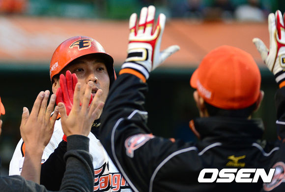 18일 오후 대전 한밭종합운동장 야구장에서 열린 2013 한국야쿠르트 세븐프로야구 한화 이글스와 NC 다이노스의 경기, 2회말 무사에서 한화 김태균이 좌월 솔로 홈런을 치고 덕아웃에서 동료들의 축하를 받고 있다.