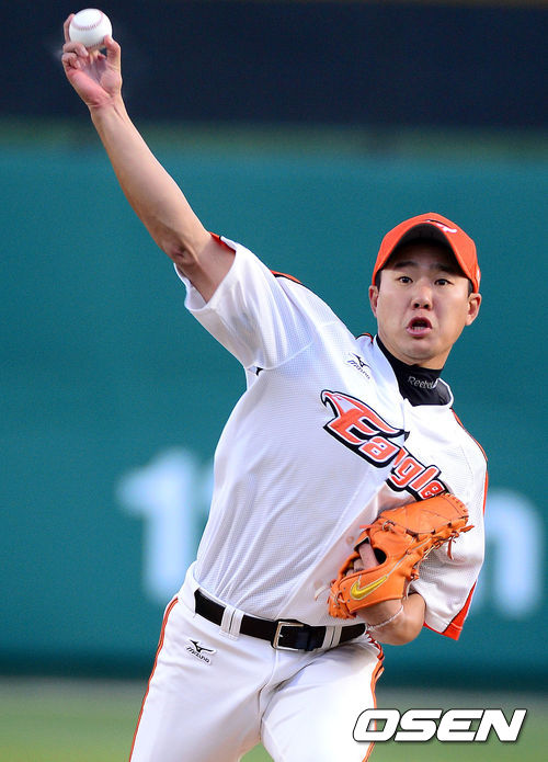 18일 오후 대전 한밭종합운동장 야구장에서 열린 2013 한국야쿠르트 세븐프로야구 한화 이글스와 NC 다이노스의 경기, 1회초 한화 선발 투수 김광수가 힘차게 공을 던지고 있다.