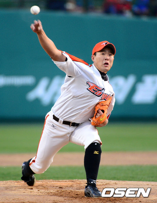 18일 오후 대전 한밭종합운동장 야구장에서 열린 2013 한국야쿠르트 세븐프로야구 한화 이글스와 NC 다이노스의 경기, 1회초 한화 선발 투수 김광수가 힘차게 공을 던지고 있다.