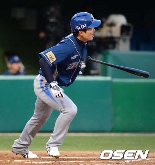 18일 오후 대전 한밭종합운동장 야구장에서 열린 2013 한국야쿠르트 세븐프로야구 한화 이글스와 NC 다이노스의 경기, 2회초 1사 3루에서 NC 지석훈이 내야 땅볼을 치고 있다.