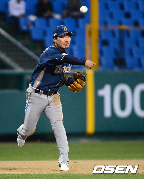 18일 오후 대전 한밭종합운동장 야구장에서 열린 2013 한국야쿠르트 세븐프로야구 한화 이글스와 NC 다이노스의 경기, 3회말 1사에서 NC 지석훈이 한화 이학준의 타구를 잡아 1루로 송구하고 있다.