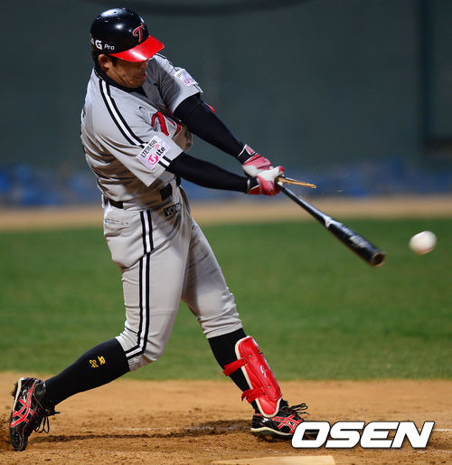 18일 오후 광주구장에서 '2013 한국야쿠르트 세븐 프로야구' KIA 타이거즈 대 LG 트윈스의 경기가 열렸다. 3회초 LG 공격 2사 2, 3루 상황 5번 정의윤이 동점 2타점 적시타를 날리고 있다.