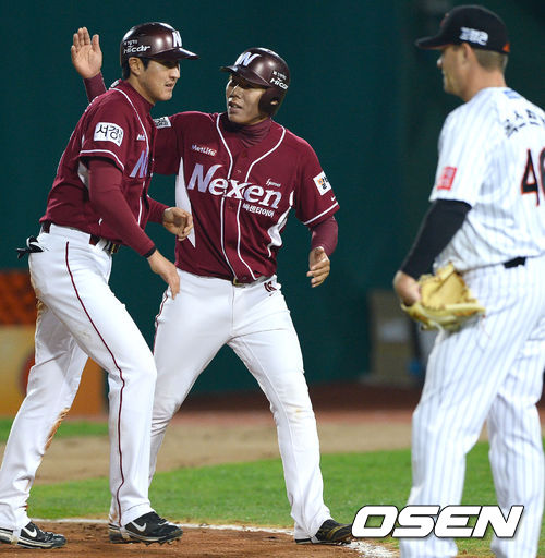 18일 오후 부산 사직구장에서 열린 '2013 한국야쿠르트 세븐 프로야구' 롯데 자이언츠와 넥센 히어로즈의 경기 3회초 2사 만루 넥센 서건창의 2타점 적시타때 2루 주자 유한준이 세이프된후 강정호의 격려를 받고 있다