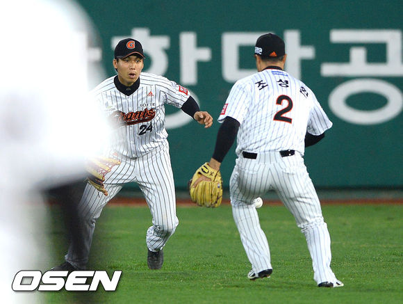 18일 오후 부산 사직구장에서 열린 '2013 한국야쿠르트 세븐 프로야구' 롯데 자이언츠와 넥센 히어로즈의 경기 2회초 1사 넥센 김민성의 우익수 앞 안타때 롯데 조성환 2루수와 김문호 우익수가 타구를 놓치고 있다