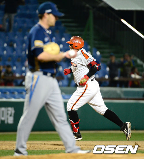 18일 오후 대전 한밭종합운동장 야구장에서 열린 2013 한국야쿠르트 세븐프로야구 한화 이글스와 NC 다이노스의 경기, 4회말 1사 2루에서 한화 김태균이 중월 역전 투런 홈런을 치고 그라운드를 돌고 있다.
