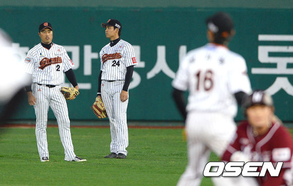 18일 오후 부산 사직구장에서 열린 '2013 한국야쿠르트 세븐 프로야구' 롯데 자이언츠와 넥센 히어로즈의 경기 2회초 1사 넥센 김민성의 우익수 앞 안타때 롯데 조성환 2루수와 김문호 우익수가 타구를 놓치고 있다