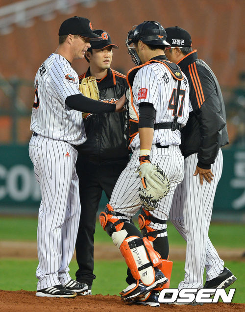 18일 오후 부산 사직구장에서 열린 '2013 한국야쿠르트 세븐 프로야구' 롯데 자이언츠와 넥센 히어로즈의 경기 2회초 1사 만루 롯데 옥스프링 선발투수가 정민태 투수 코치와 이야기를 나누고 있다