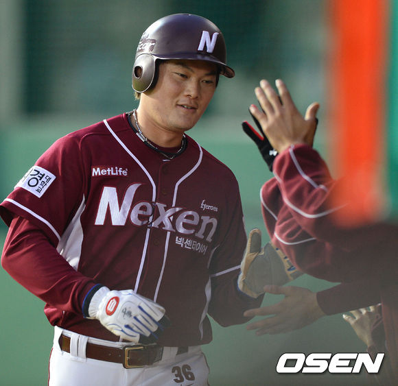 18일 오후 부산 사직구장에서 열린 '2013 한국야쿠르트 세븐 프로야구' 롯데 자이언츠와 넥센 히어로즈의 경기 2회초 1사 만루 넥센 허도환의 선취 1타점 적시타때 3루 주자 이성열이 홈을 밟은 후 동료들과 하이파이브를 하고 있다