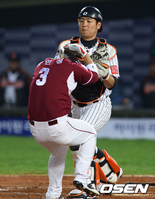 18일 오후 부산 사직구장에서 열린 '2013 한국야쿠르트 세븐 프로야구' 롯데 자이언츠와 넥센 히어로즈의 경기 2회초 1사 만루 넥센 서건창의 내야땅볼때 3루 주자 김민성이 롯데 강민호 포수에게 태그아웃되고 있다