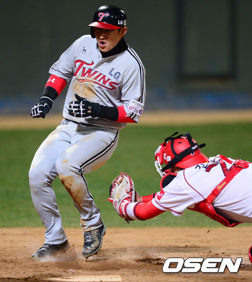 18일 오후 광주구장에서 '2013 한국야쿠르트 세븐 프로야구' KIA 타이거즈 대 LG 트윈스의 경기가 열렸다. 4회초 LG 공격 2사 1, 2루 상황 6번 손주인의 우익수 앞 안타때 2루 주자 박용택이 홈으로 쇄도하며 포수 김상훈의 태그를 피하고 있다. 하지만 홈을 제때 밟지 못해 아웃.