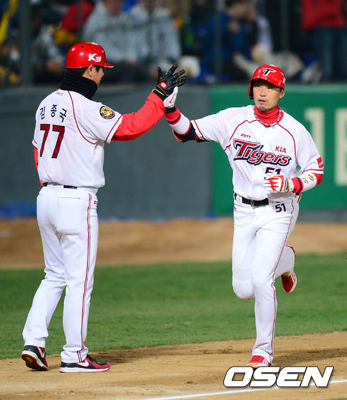18일 오후 광주구장에서 '2013 한국야쿠르트 세븐 프로야구' KIA 타이거즈 대 LG 트윈스의 경기가 열렸다. 4회말 KIA 공격 선두타자로 나선 9번 김원섭이 우월 솔로포를 날리고 김종국 3루코치와 하이파이브를 나누고 있다.