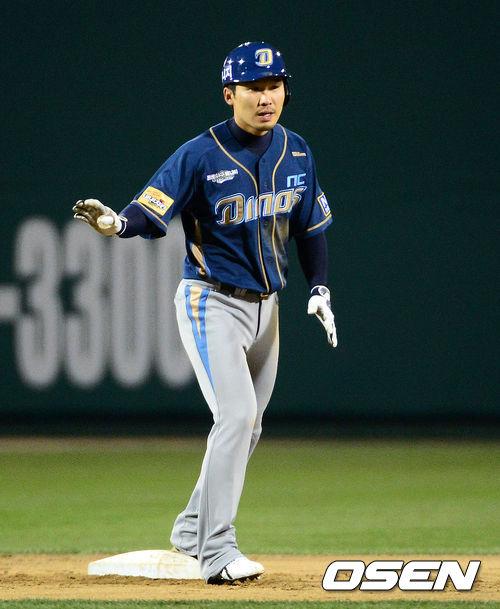 18일 오후 대전 한밭종합운동장 야구장에서 열린 2013 한국야쿠르트 세븐프로야구 한화 이글스와 NC 다이노스의 경기, 6회초 1사 만루에서 NC 지석훈이 좌전 3타점 적시 2루타를 치고 타임을 외치고 있다.