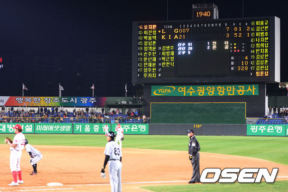 18일 오후 광주구장에서 '2013 한국야쿠르트 세븐 프로야구' KIA 타이거즈 대 LG 트윈스의 경기가 열렸다. 3회초 LG공격 2사 1루 1번 오지환의 타석 때 7득점을 보여주는 전광판의 모습.