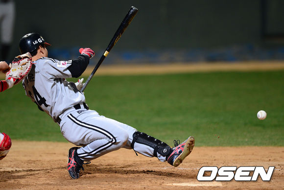 18일 오후 광주구장에서 '2013 한국야쿠르트 세븐 프로야구' KIA 타이거즈 대 LG 트윈스의 경기가 열렸다. 5회초 LG 공격 무사 1루 상황 8번 현재윤이 번트를 시도하며 뒤로 넘어지고 있다.