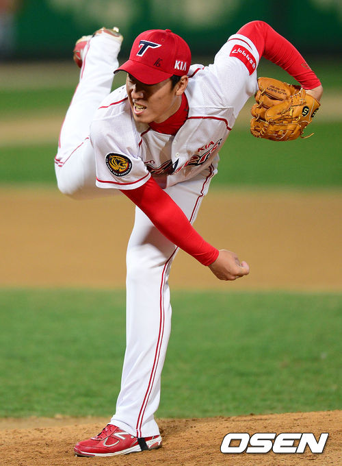 18일 오후 광주구장에서 '2013 한국야쿠르트 세븐 프로야구' KIA 타이거즈 대 LG 트윈스의 경기가 열렸다. 5회초 LG 공격 때 KIA투수 이대환이 힘차게 공을 던지고 있다.