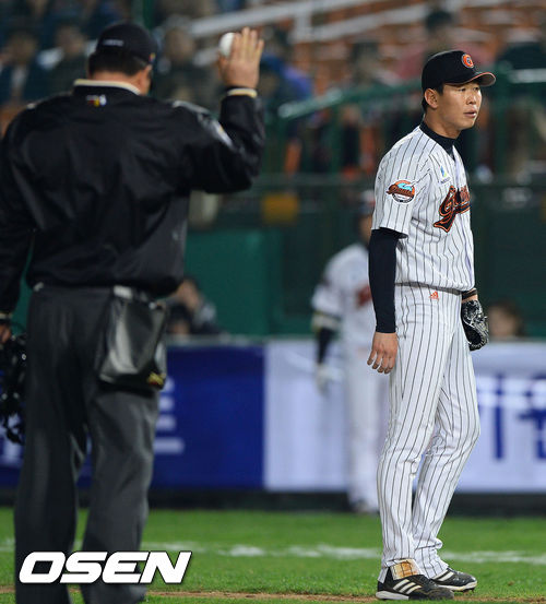 18일 오후 부산 사직구장에서 열린 '2013 한국야쿠르트 세븐 프로야구' 롯데 자이언츠와 넥센 히어로즈의 경기 7회초 2사 넥센 허도환에 이어 서건창에게 몸에 맞는 공을 던진 롯데 진명호 투수가 퇴장당하고 있다.