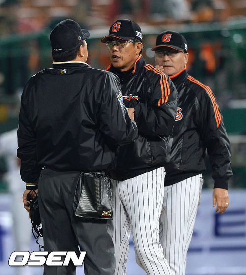 18일 오후 부산 사직구장에서 열린 '2013 한국야쿠르트 세븐 프로야구' 롯데 자이언츠와 넥센 히어로즈의 경기 7회초 2사 넥센 허도환에 이어 서건창에게 몸에 맞는 공을 던진 롯데 진명호 투수가 퇴장 당했다. 김시진 감독이 문승훈 구심에게 항의하고 있다