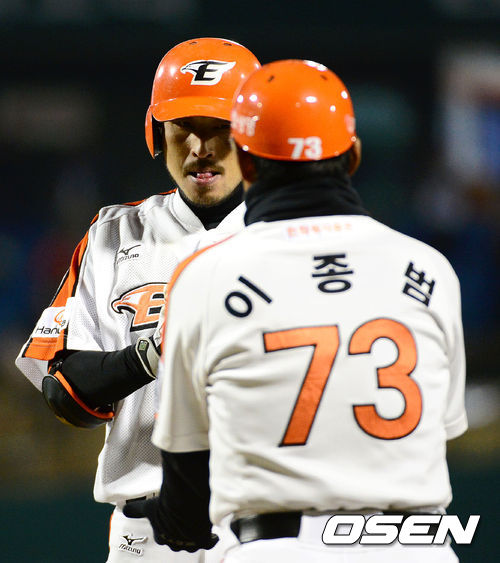 18일 오후 대전 한밭종합운동장 야구장에서 열린 2013 한국야쿠르트 세븐프로야구 한화 이글스와 NC 다이노스의 경기, 7회말 무사 3루에서 한화 김경언이 좌전 동점 적시타를 치고 이종범 코치와 하이파이브를 하고 있다.